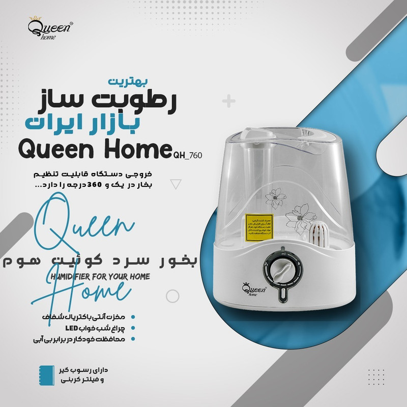 بخور سرد یکی از پر کاربردترین محصولاتی است که باید در منزل و محل کار شما وجود داشته باشد. فواید بی نظیر این محصول بسیار زیاد است . بخور سرد باعث میشود مخاط دهان و بینی مرطوب شده و امکان رشد و پیشرفت میکروب و باکتری از بین برود. ذرات گرد و غبار و آلودگی ها و میکروب ها به ذرات بخار می چسبند در نتیجه به تسویه هوای محیط کمک شایانی می کند. پزشکان دستگاه بخور سرد را برای درمان و جلوگیری انواع سرماخوردگی و مشکلات تنفسی پیشنهاد میکنند. تاثیرات مطلوب این دستگاه بر پوست و مو نیز آشکار است. علاوه بر انسان ها بخور سرد برای بهبود شرایط زیستی گیاهان و حیوانات خانگی نیز حیاتی است همچنین کودکان و نوزادان نیز برای جلوگیری از ابتلا به بیماری های تنفسی ناشی از خشکی هوا باید بخور سرد داشته باشند. کوئین هوم یکی از قدیمی ترین وبا کیفیت ترین برند های تولید بخور سرد در ایران است که با محصول جدید خود یعنی بخور سرد 760 توانسته بخش بزرگی از بازار رقابتی را از آن خود کند. این محصول با کیفیت همه آنچه از بخور سرد انتظار دارید حتی بیشتر در اختیار شما می گذارد. مخزن بزرگ این محصول ظرفیت 4.8 لیتر آب را داراست که مدت 15 ساعت بخور مداوم خواهد داشت. همینطور کلید قطع کن آن، هنگام تمام شدن آب مخزن آنرا خاموش میکند و ایمنی دستگاه را تامین می کند. این بخور سرد برای فضای 50 مترمربع مناسب میباشد و مقدار 300 میلی لیتر در ساعت بخور در محیط ایجاد میکند. همچنین صدای کم این بخور از قابلیت های بارز آن میباشد. علاوه بر تمام اینها این دستگاه به رسوب گیر مجهز شده تا مهمترین عامل خرابی بخور های سرد یعنی تجمع رسوبات را کاهش دهد. وجود کلید شب خواب نیز بر زیبایی آن خواهد افزود و کاربردی چند منظوره برای این محصول ایجاد می کند که قابلیت خاموش و روشن شدن جدا را نیز دارد . میزان بخور دهی دستگاه توسط یک ولوم قابل تنظیم است.