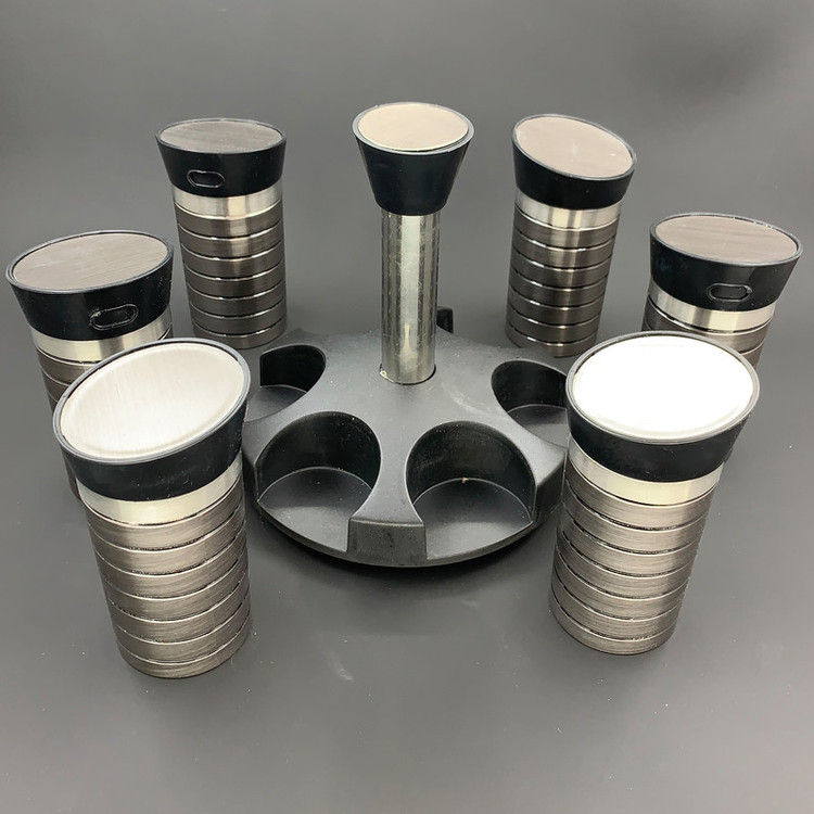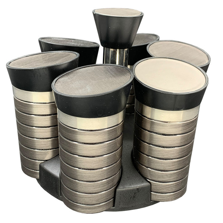 شامل یک پایه نگهدارنده و شش عدد جای ادویه قطر داخلی هر عدد جای ادویه: 5 سانتیمتر ارتفاع داخلی هر عدد جای ادویه: 8.5 سانتیمتر ارتفاع جای ادویه با در: 12 سانتیمتر جنس پلاستیک با طرح استیل
