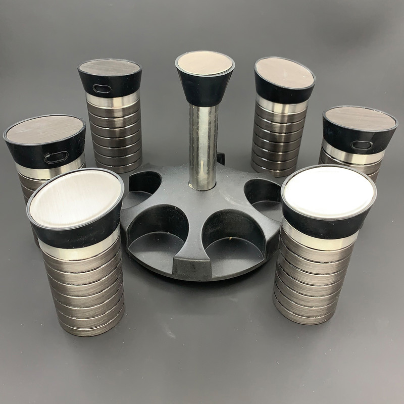 شامل یک پایه نگهدارنده و شش عدد جای ادویه قطر داخلی هر عدد جای ادویه: 5 سانتیمتر ارتفاع داخلی هر عدد جای ادویه: 8.5 سانتیمتر ارتفاع جای ادویه با در: 12 سانتیمتر جنس پلاستیک با طرح استیل