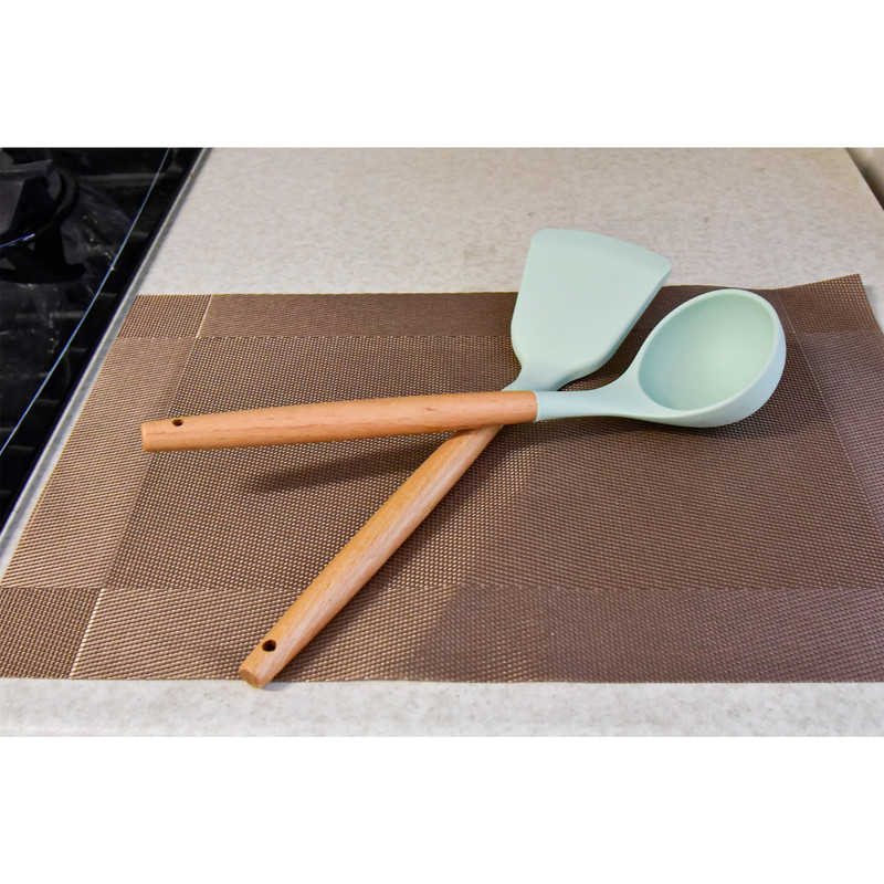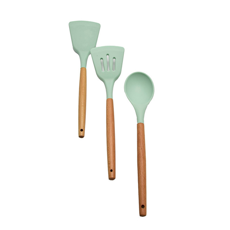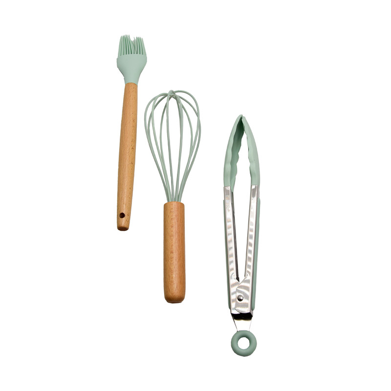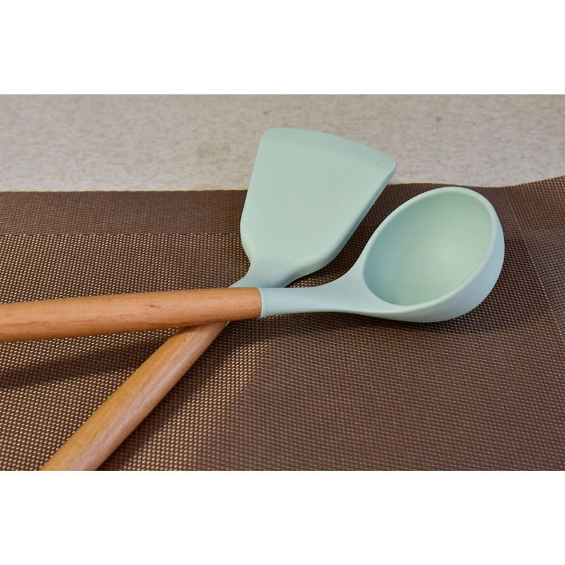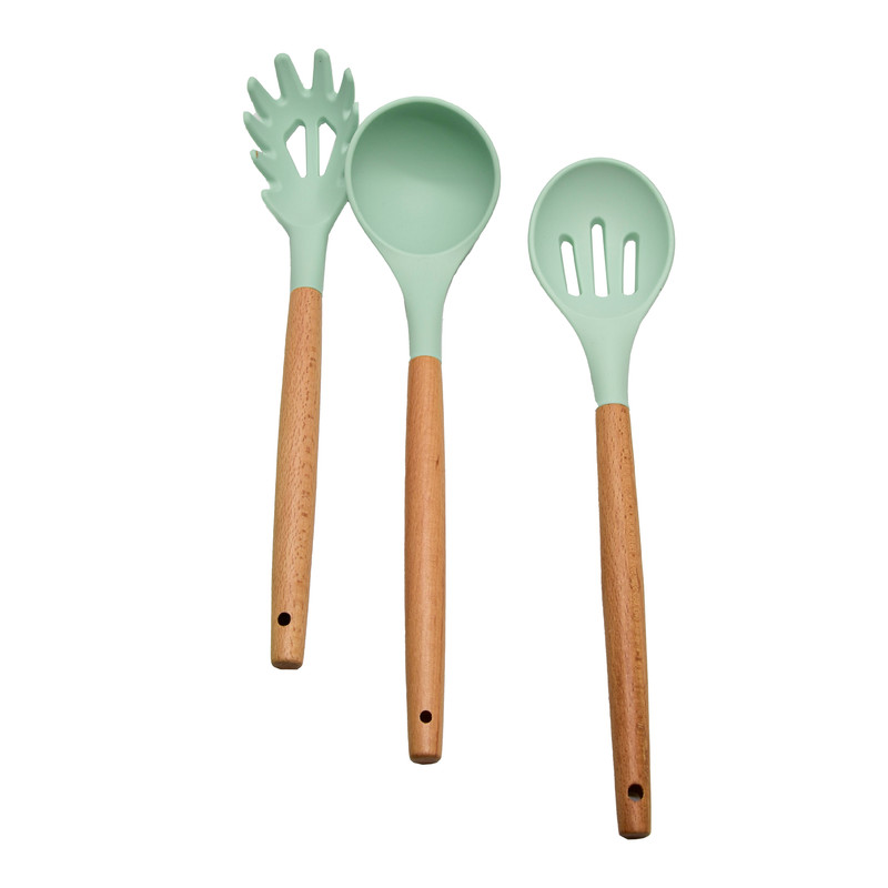 دارای اقلام: کفگیر پختوپز چنگال پختوپز ملاقه همزن کفگیر کیک قاشق سالاد چنگال سالاد قاشق پختوپز انبر دارای دسته چوبی بامبو سر سیلیکونی نسوز طراحی اروپایی رنگبندی متنوع