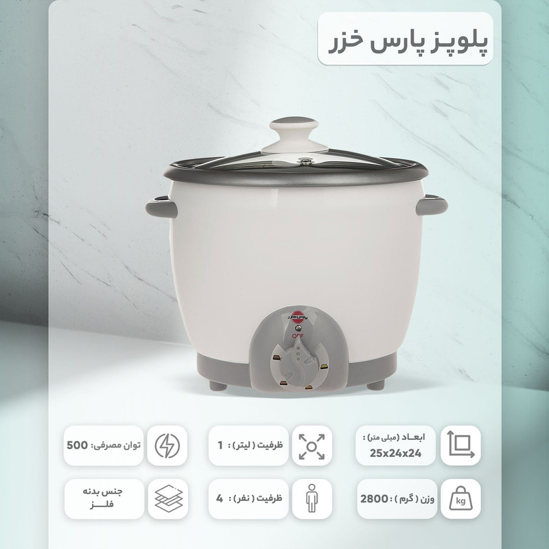 پلوپز «پارس خزر» (Pars Khazar) مدل «RC-181 TYAN» یک محصول با ظرفیت بالا، طراحی بسیار ساده به همراه قابلیتهای فراوان است. این محصول با ظرفیت بالایش، میتواند در هر دورهی پختوپز، وعدهی غذایی 8 نفر را تامین کند. در نتیجه این محصول برای خانوادههای پرجمعیت، گزینهی مناسبی است. همچنین جنس ظرف تفلون نچسب و دیگ قابل جدا شدن، کاربری این محصول را آسانتر کرده است. از دیگر مشخصات کلی این کالا میتوان به توان مصرفی پایین، استفاده از تایمر و ترموستات با دقت و کیفیت بالا جهت تنظیم حالتهای مختلف پخت مواد غذایی و مصرف بهینه انرژی، استفاده از سیمهای نسوز جهت افزایش ایمنی محصول و استفاده از مواد پلاستیکی بهداشتی و مقاوم در برابر حرارت اشاره کرد. در نظر داشته باشید که پارس خزر، یک شرکت بزرگی ایرانی است که از سال 1347 با همکاری شرکت توشیبا ژاپن، آغاز به کار کرده است. این شرکت در زمینههای ساخت لوازمخانگی، فعالیتهای گستردهای را در کشور انجام میدهد.