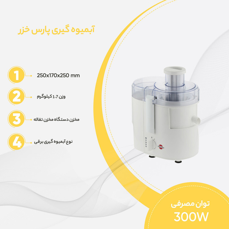 آبمیوهگیری پارسخزر مدل مانگو، انتخابی ایدهآل برای کسانی است که بهدنبال یک دستگاه با عملکرد بالا و طراحی زیبا هستند. این آبمیوهگیری با حداکثر توان مصرفی ۳۰۰ وات، قدرتی مناسب برای استخراج آبمیوه از انواع میوهها ارائه میدهد و بهسرعت و بهطور مؤثر، آبمیوه تازه و طبیعی تهیه میکند. مدل مانگو از نوع آبمیوهگیریهای برقی است که با طراحی مدرن و کاربرپسند خود، استفاده از آن را برای شما راحت و آسان میسازد. مخزن تفاله این دستگاه به شما این امکان را میدهد که تفالههای میوه را بهراحتی جدا کرده و تنها آبمیوه ناب و بدون پالپ را دریافت کنید. ابعاد دستگاه 250×170×250 سانتیمتر است که آن را به یک وسیله کاربردی و جمعوجور برای هر آشپزخانه تبدیل میکند. وزن سبک آن، ۱.۷ کیلوگرم است که جابهجایی آن را بسیار راحت میکند. این آبمیوهگیری با طراحی خاص و کیفیت ساخت بالا، علاوهبر اینکه به زیبایی فضای آشپزخانه شما میافزاید، تجربهای راحت و لذتبخش از تهیه آبمیوه را برای شما به ارمغان میآورد. انتخاب آبمیوهگیری پارسخزر مدل مانگو، راهی مناسب برای بهرهمندی از آبمیوههای تازه و سالم در خانه است.