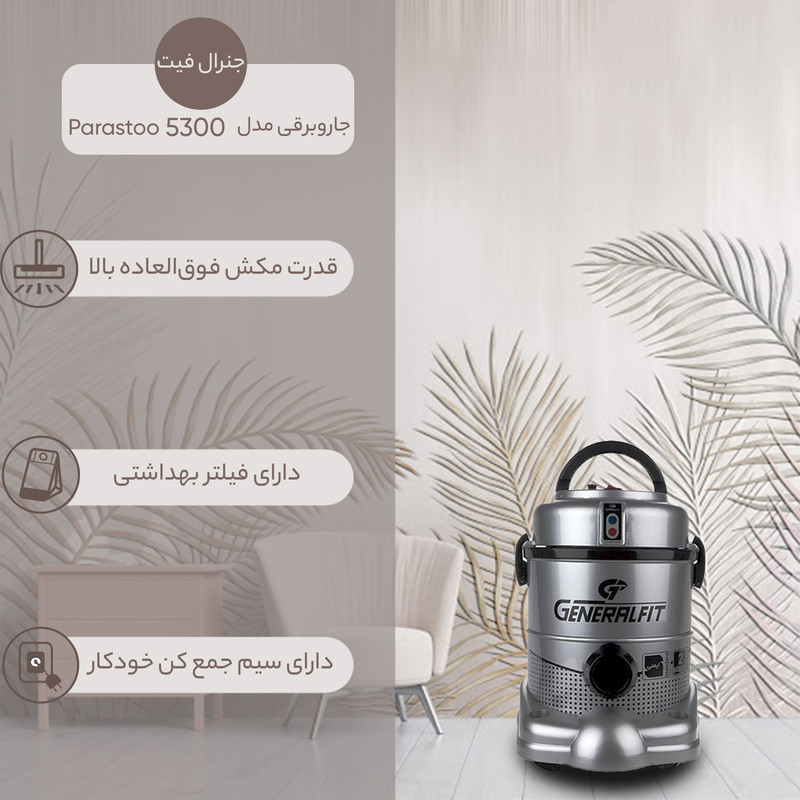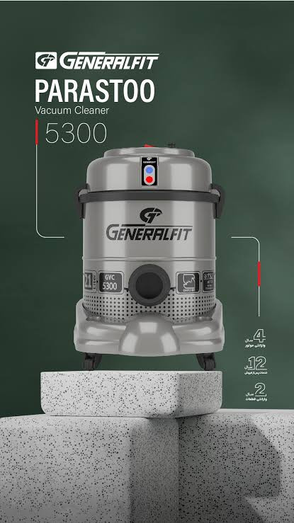 جاروبرقی «جنرال فیت» (General Fit) مدل «Parastoo 5300» از قدرتی زیاد و کیفیتی مطلوب بهره میبرد. این دستگاه که در ردیف جاروهای سطلی قرار میگیرد، گنجایش قابلتوجهی دارد و میتواند با توجه به کیفیت عملکرد و ویژگیهایش برای انواع منازل ویلایی،سالنهای بزرگ همچون فروشگاهها، مساجد و بهویژه رستوران و هتلها مورد استفاده قرار گیرد. جاروبرقی جنرال فیت مدل Parastoo 5300 از قطعات باکیفیتی ساخته شده تضمینکنندهی عملکرد و طول عمر زیاد آن است. این مدل دارای سیمجمعکن نیز هست که از مزایای این دستگاه محسوب میشود؛ برای استفاده از این قابلیت، پس از بیرون کشیدن کابل، بایستی بهوسیلهی دستگیرهای که در بالای جاروبرقی قرار دارد، سیم را جمع کنید. گفتنی است، چرخهای پایه بسیار روان هستند و قابلیت چرخش 360 درجهای دارند تا هنگامیکه آن را بهدنبال خود میکشید، واژگون نشود. این جاروبرقی دارای سریهای مختلفی هستند و هر کدام برای نظافت بخش خاصی طراحی شدهاند. کابل 6 متری دارد که به انعطافپذیری دستگاه افزوده است؛ چراکه در نظافت محیطهای بزرگ، میتوانید بهراحتی و بدون نیاز به اتصال جاروبرقی به پریز نزدیک، نظافت را انجام دهید. مدل Parastoo 5300 به موتور دو پروانه تکنولوژی AEG آلمان مجهز شده است و قدرت موتور 1300 واتی دارد که نقطهی قوت آن محسوب میشود؛ قدرت مکندگی این دستگاه در سطح ایدئالی قرار دارد و نظافت سریع و بیدردسر را فراهم میکند. دبی هوای این جاروبرقی 58dm3/sec است. این محصول دارای یک لولهی تلسکوپی است که به کاربر امکان تغییر ابعاد و تنظیم آن نسبت به محیط نظافت و قد خود را میدهد. مخزن جاروبرقی 21 لیتری است؛ جاروبرقیهای سطلی مخزن بزرگی دارند که نقطهی قوت آنها بهشمار میرود و دیگر نیازی نیست که به دفعات محفظه را خالی کنید.همچنین امکان نصب کیسه یکبار مصرف هپا فراهم شده است. جاروبرقی Parastoo 5300 آنتی استاتیک است؛ به عبارتی الکتریسیته ساکن جمع شده در پوسته دستگاه تخلیه میشود. این محصول دارای لوله خرطومی باکیفیت است؛ این لوله خرطومی از مواد درجهی یک ساخته شده تا بسیار بادوام باشد و با استفادهی چندین ساله و خمشهای متداول آسیبی نبیند.